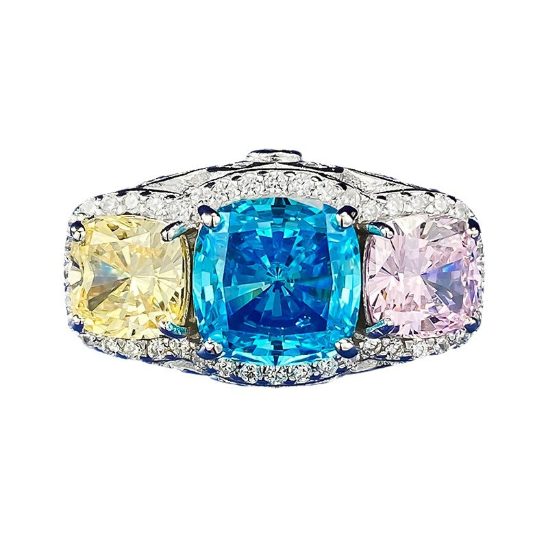 Urqanyu 2 carat imitation color inlaid yellow, blue and pink personality full diamond contrast color cubic zirconia diamond ring